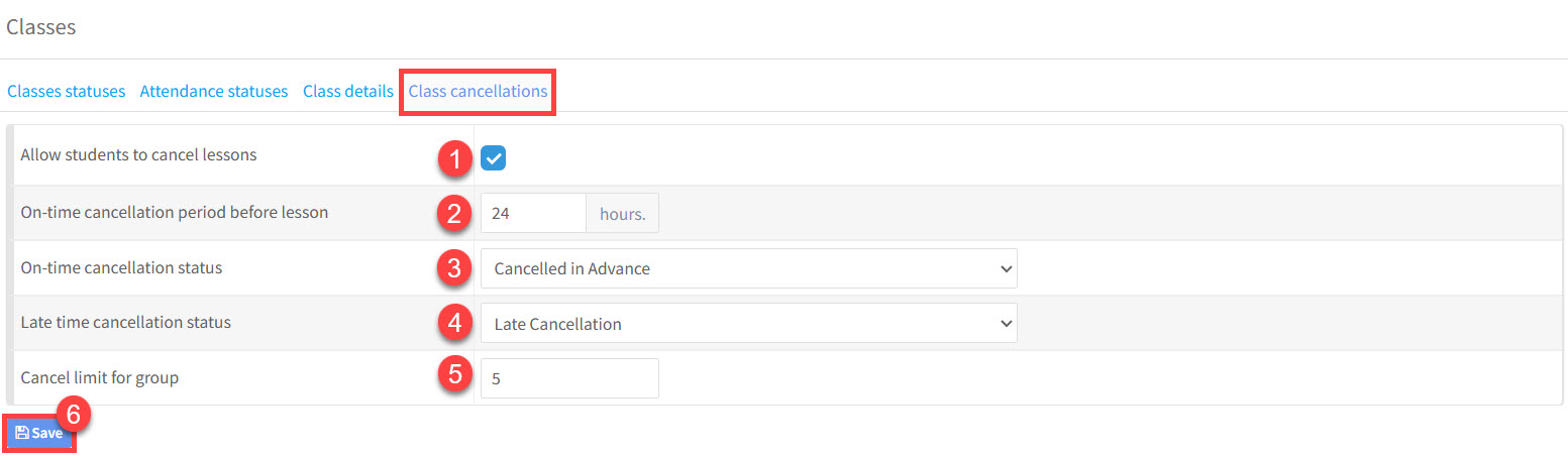 - Enter the number of hours before the start of the lesson that will determine whether it is cancelled in advance or late. In the case below the settings is 24 hours. So, if the student cancels 25 hours before the start of the lesson, it will be counted as cancelled in advance and if 23 hours before the start it will be considered late and the student will be charged for the lesson.