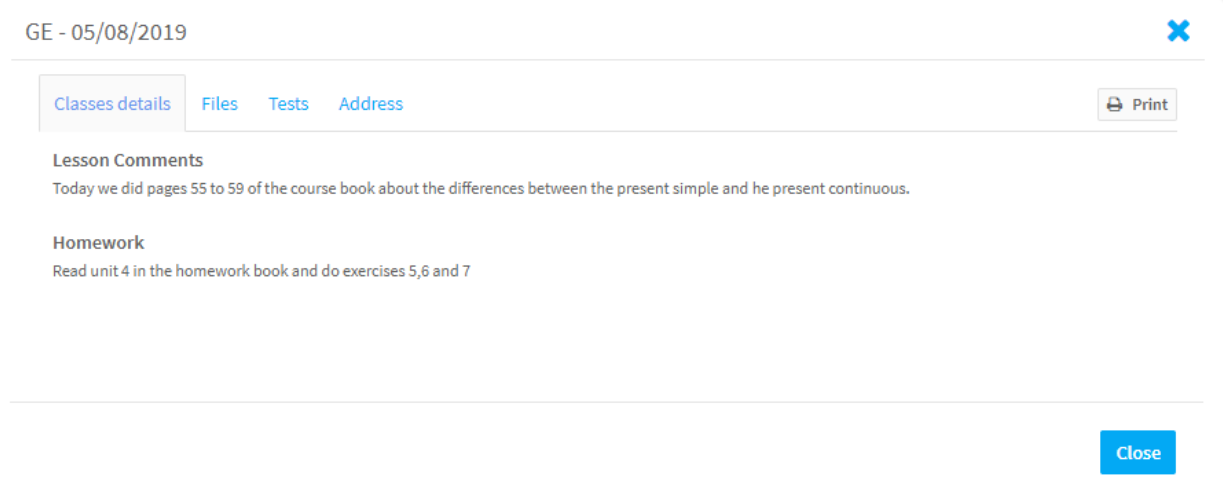 The bottom half of the page lists your lessons and tells you if Attendance and Lesson Details have been added. You can also see if your teacher has uploaded any Files to the lesson. If you click the Information button on the right, you will be able to see the Lesson Details and Files, Tests and other information added about the lesson: