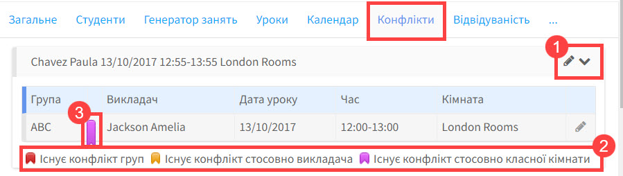 Якщо у вас один або два конфлікта, ви можете відредагувати їх із розділу “Конфлікт”. Якщо конфліктів більше, буде швидше відредагувати їх усі разом зі сторінки уроку. Як варіант, ви можете видалити усі уроки і ще раз створити їх, використовуючиI “Генератор занять”.