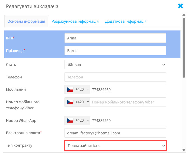 The contract type is stored on each employee’s SchoolMate card; here is an example of a teacher: