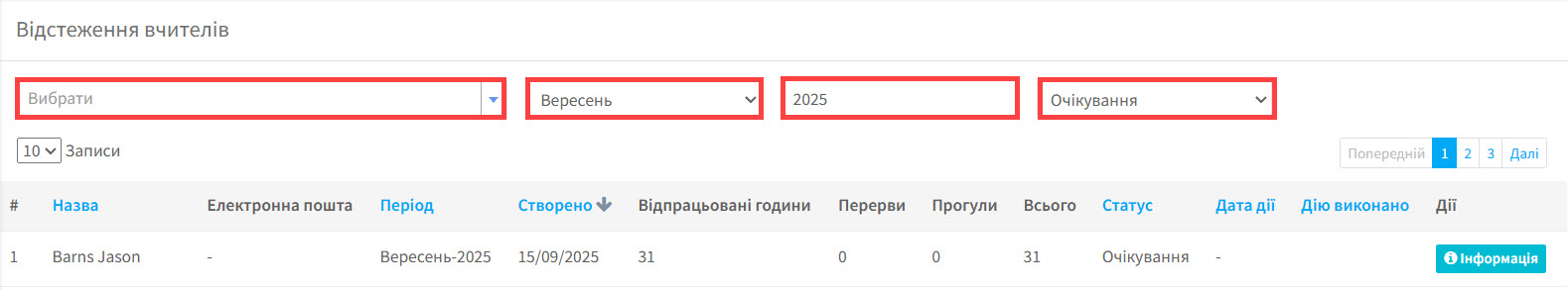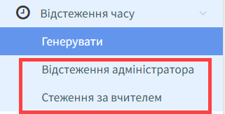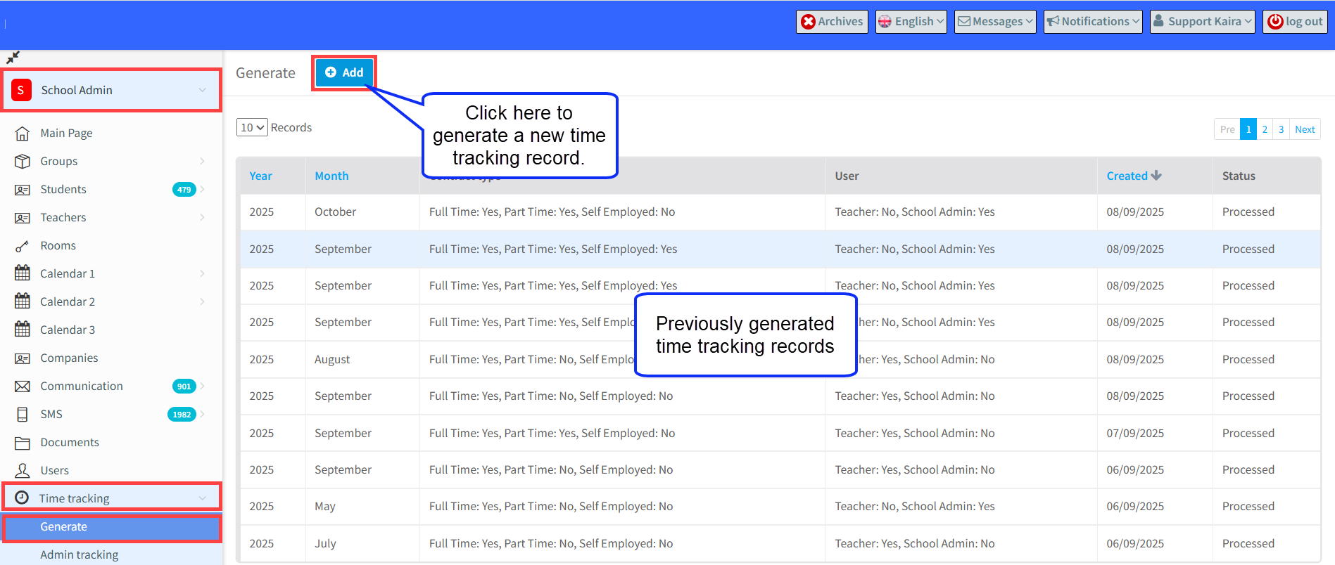 Once generated, time tracking records are stored according to the user type: Teachers and Admin users. So, you can switch between the two according to their type to see all records: