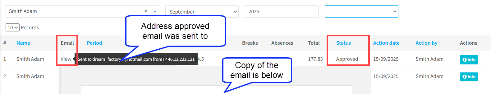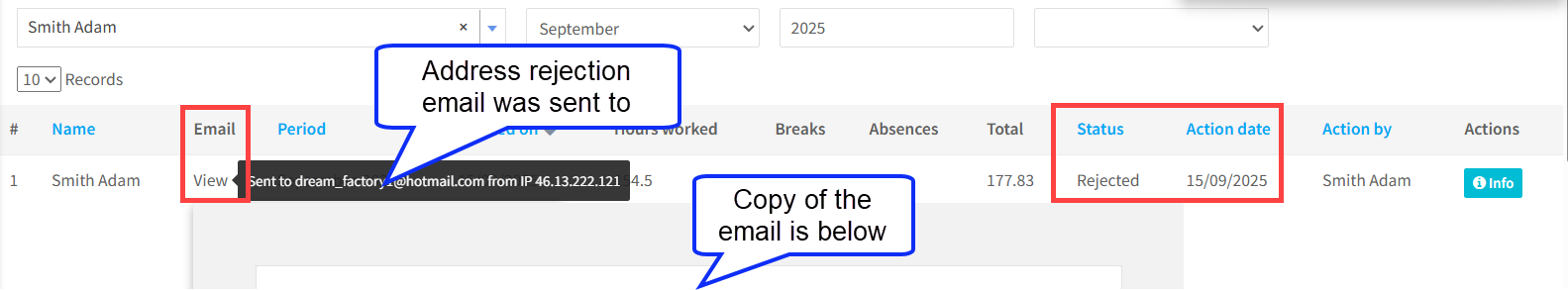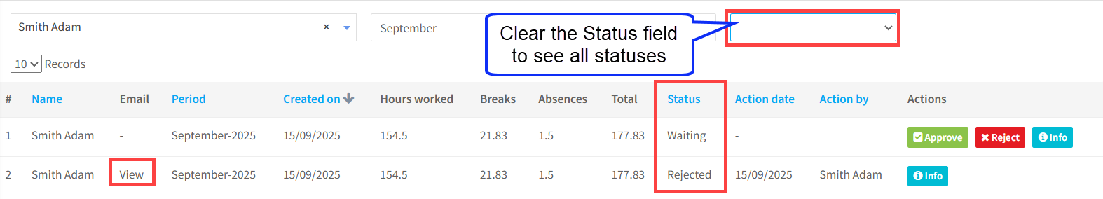 Use filters to check the status of records (Approved, Rejected, Pending).