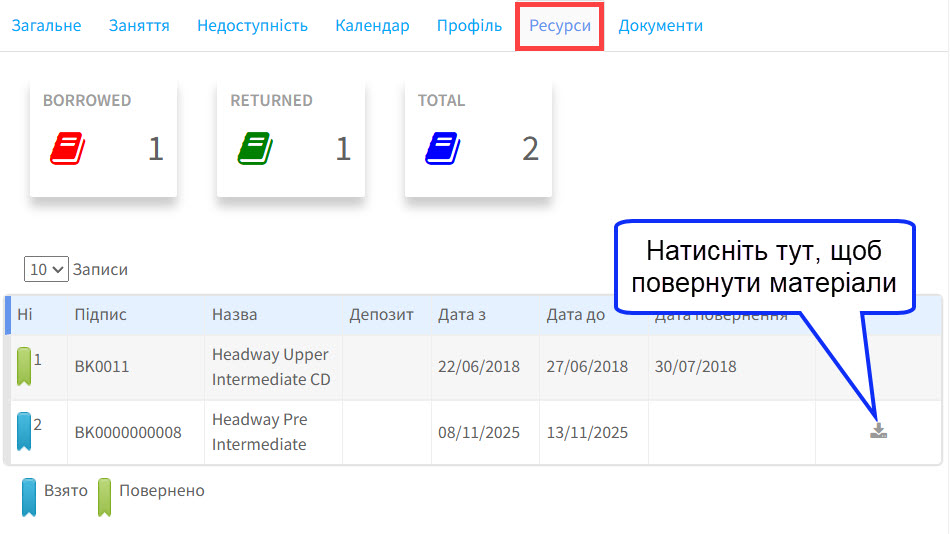 The results of the borrowing and returning of items are displayed on the Resources card: