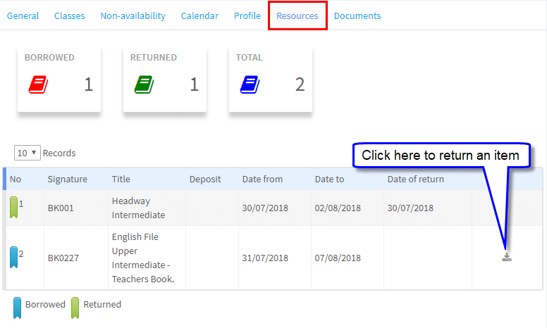 If your school has the Resources Module switched on, teachers can reserve resources items via their account when they log in. You can also allocate them items to teachers directly as explained here.