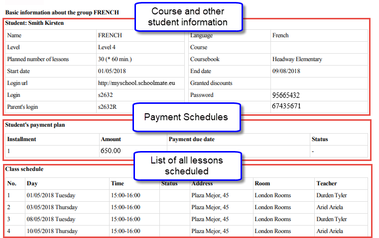 2. Інформація про групу – ви можете роздрукувати всю інформацію про курси, оплати та уроки студента: