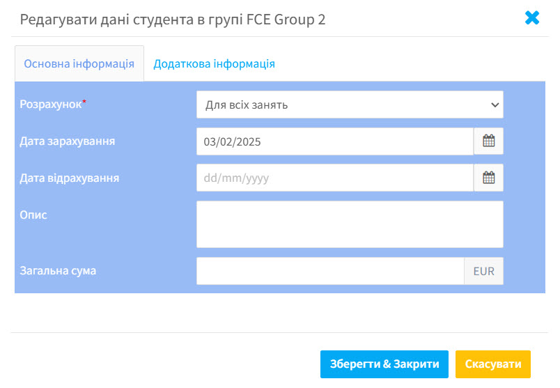 1. Вийти з групи – введіть дату, коли студент залишив групу. Всі записи, відвідуваності й т.д. будуть зберігатися в системі, але ця інформація не буде відображатися в записах після дати відрахування.