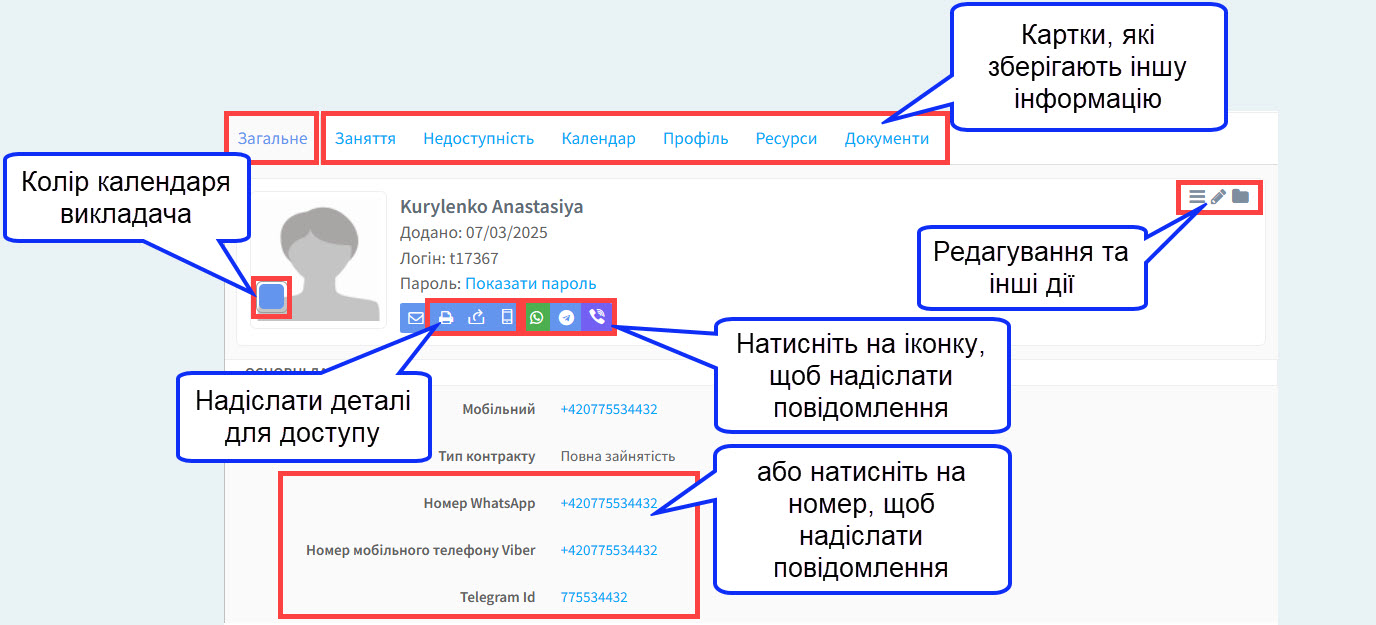 Після того як ви створите картку викладача в системі, з’явиться наступна картка: